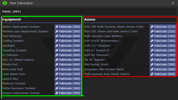Фабрикатор частей дропшипа — основной способ получения оборудования для дропшипов или замены исчерпанных боеприпасов. Работает по системе очков: одно очко зарабатывается каждые две секунды. Очки можно потратить на перечисленные ниже предметы, если их хватает. Обычно изготовление занимает около двенадцати секунд и более.